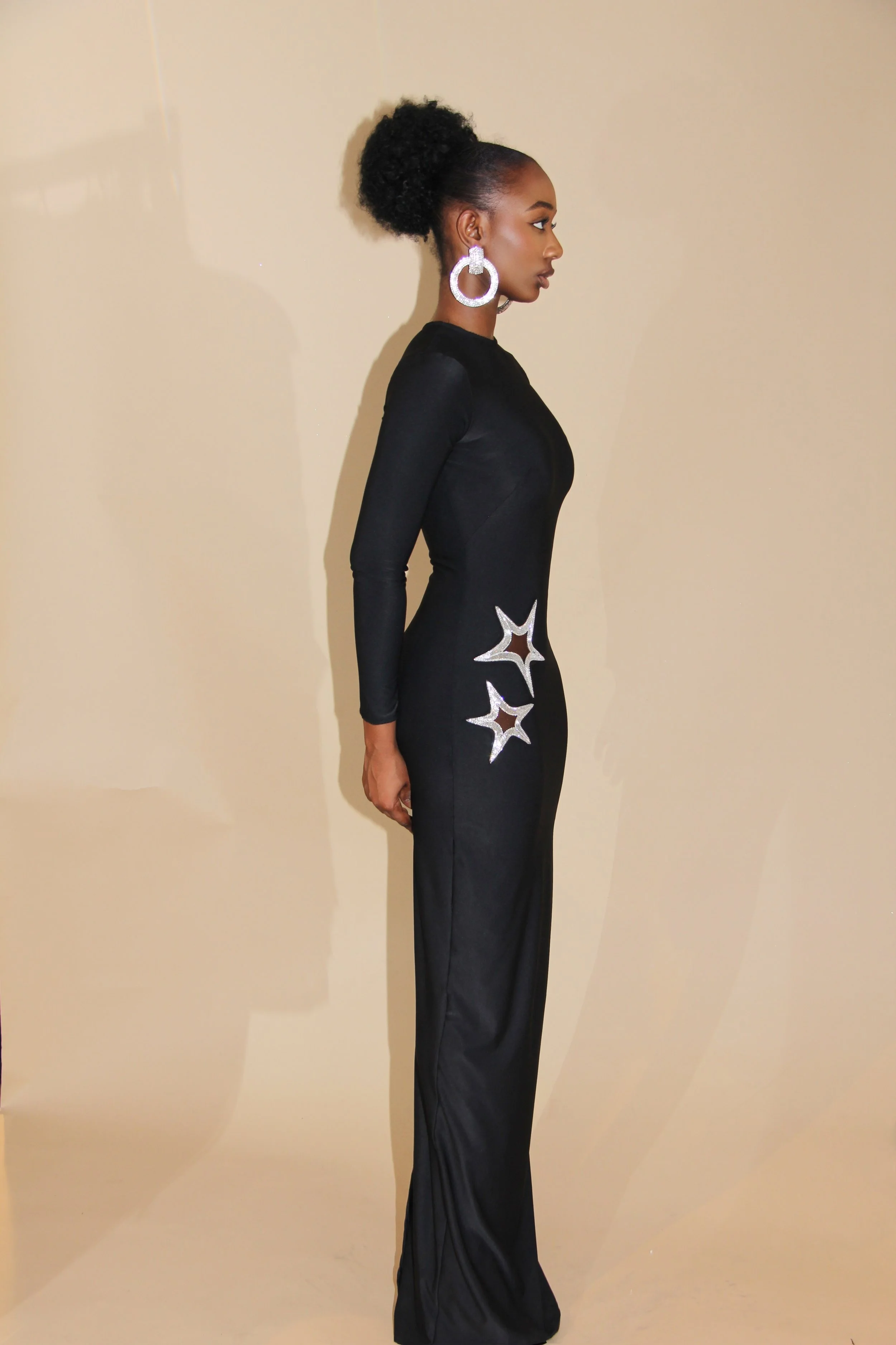 FW25 COLLECTION BLACK STAR LONG GROWN $249.00 BLACK TAFFETA PANTS $175.00 PRINT HIGH NECK DRESS $275.00 BROWN BOMBER JACKET $198.00 BLACK DRAPE CORSET $240.00 CHETAH PRINT PANTS $210.00 WHITE TAFFETA SKIRT $160.00 WHITE TAFFETA TOP $149.00 DRAPE SEQUINS CORSET DRESS $1,249.00